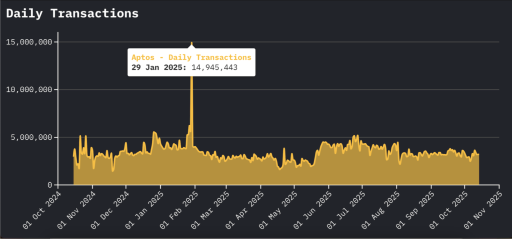 - The daily transactions spike coincides with the native launch of USDC (Circle’s stablecoin) on Aptos in January 2025. It enabled seamless cross-chain transfers and boosting DeFi and stablecoin activity.