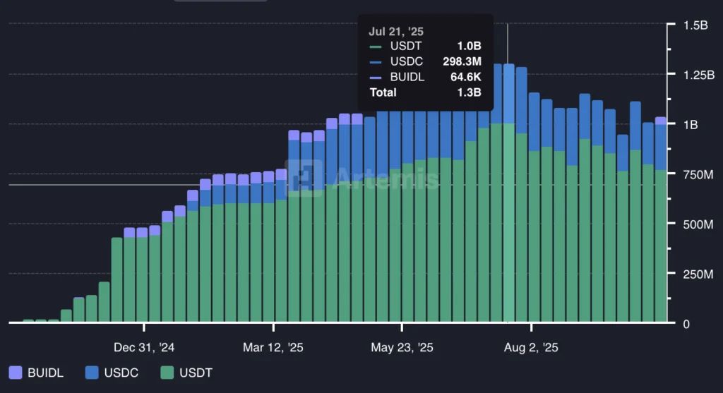 Aptos integrated native support for major stablecoins like Tether’s USDT and Circle’s USDC, which enabled seamless on-chain transfers without bridges. Integrations with exchanges like Binance, Kraken, and Crypto.com allowed for direct deposits and withdrawals. By mid-2025, stablecoin supply on Aptos reached $1.35B, with USDT growing 8x and USDC 2x since launch.