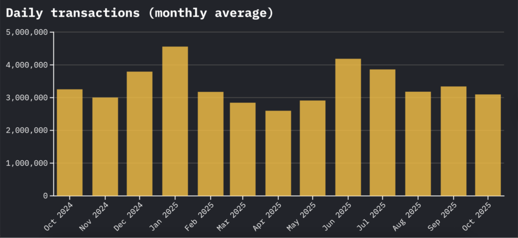 Comparing October 2024 to October 2025, the transaction volume showed a slight decline of about 4.8% (from 3,254,076 to 3,097,273 transactions daily), which contrasts with the 80% increase in daily active addresses noted earlier.