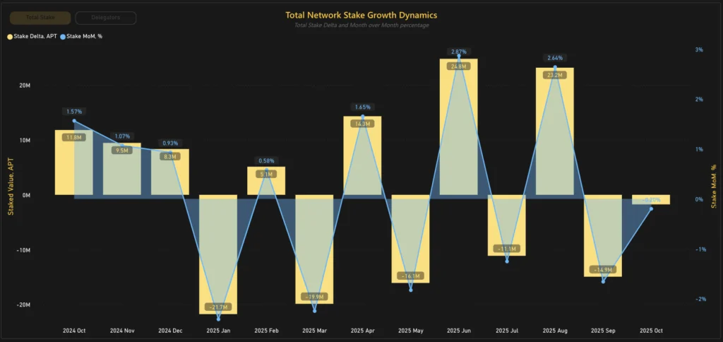 The chart reveals a pattern of positive growth in Stake MoM% in more than a half of months. The trend keeps up with the steady growth during the early months post-second anniversary, with October 2024 adding 11.8 million APT (1.57% month-over-month), followed by 9.5 million in November (1.07%) and 8.3 million in December (0.93%). That said, the period from January to October 2025 indicates severe volatility reacting to seasonal adjustments, token unlocks, or broader crypto market volatility affecting confidence.