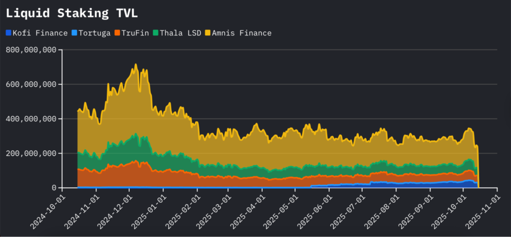 Leaders in liquid staking include seven main protocols, with current (October 16, 2025) TVL dominated by Amnis Finance at $121.6 million (about 39% market share), followed by Thala at $43.9 million (14%), TruFin Protocol at $38.2 million (12%), Kofi Finance at $28.7 million (9%), Echo Liquid Staking at $8.3 million (3%), Ditto at $1.9 million (1%), and Tortuga at $0.06 million (negligible).
