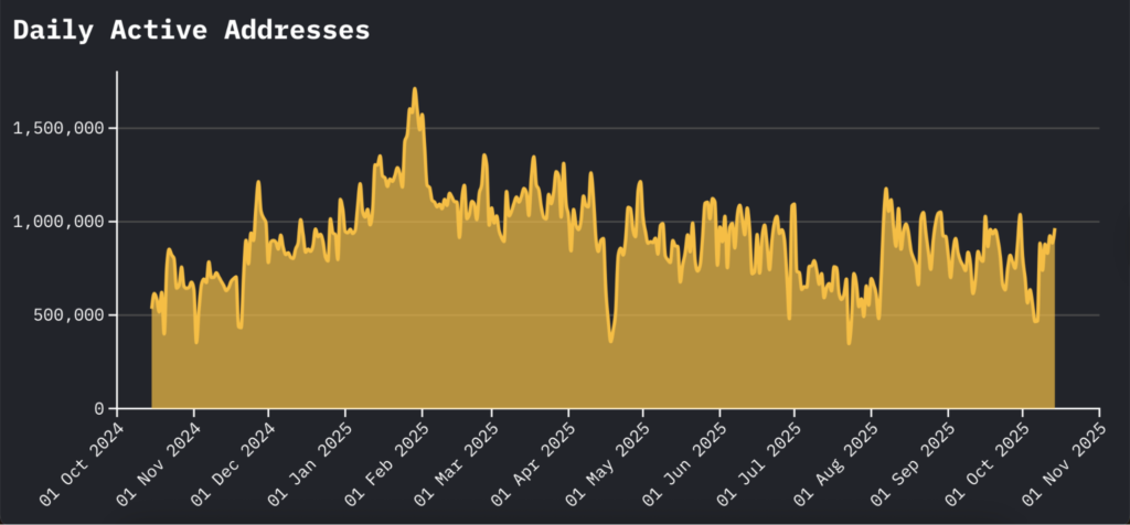 The DAA chart below shows a clear improvement, rising from a lower base in 2024 to a more sustained ~900,000 base and up to 1.7M spikes in 2025. This change is in line with broader 2025 trends, where daily averages often exceeded 1 million in Q1 but settled higher overall than in 2024.