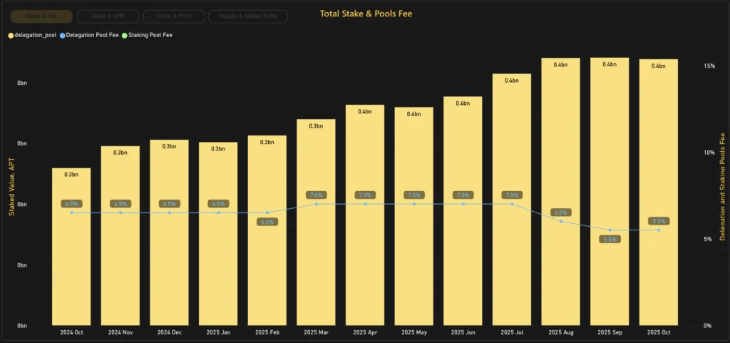 The chart tracking total delegated stake and associated fees from October 2024 to October 2025 illustrates a clear upward trajectory in stake value, rising from approximately 0.3 billion APT (300 million) at the start to 0.4 billion APT (400 million) by present time, which indicates a net increase of about 33%.