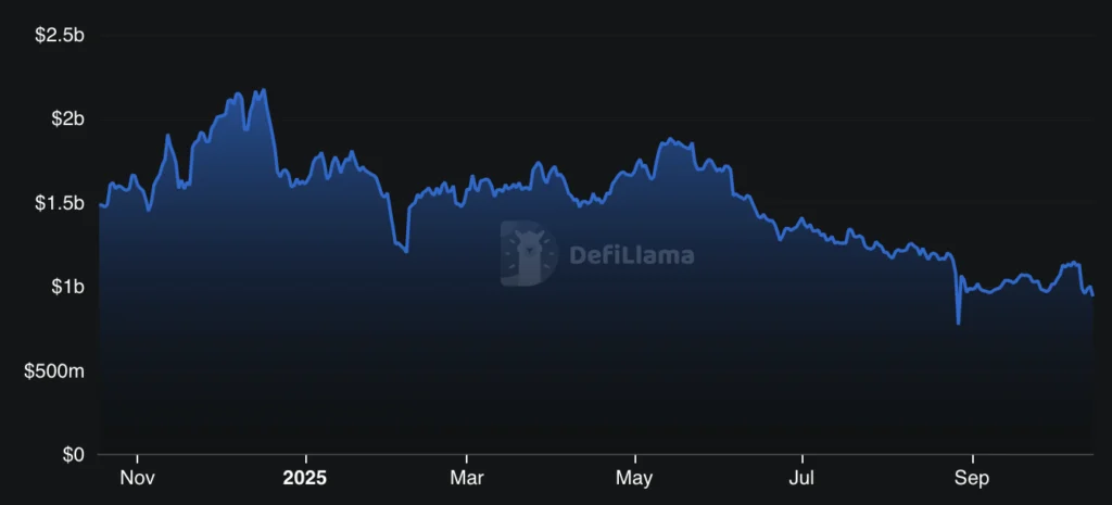 The chart below tracks Aptos’s base TVL over the past year since its second anniversary in October 2024. It soared from about $874 million to a peak of $1.13 billion in early 2025, a growth of nearly 30%, driven by new apps and stablecoin inflows. Since then, it has dropped to around $710 million by mid-October 2025, due to token unlocks and market shifts.