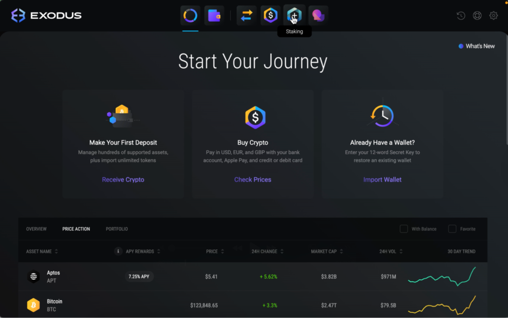 Exodus is a non-custodial, multi-asset wallet that is available on desktop and mobile. It allows users to manage crypto assets, access Web3 apps, and stake supported tokens directly from the interface, without sharing private keys or relying on centralized services.