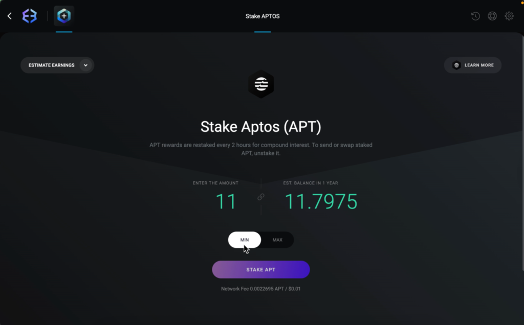 You’ll see your estimated balance in one year, including compounded rewards. Click Stake APT.