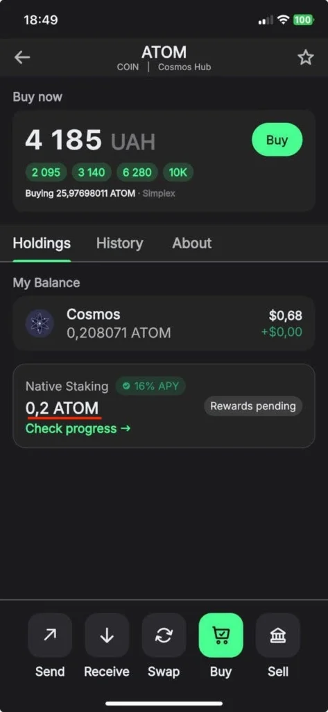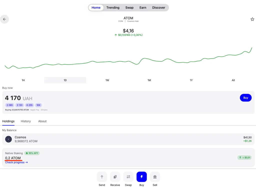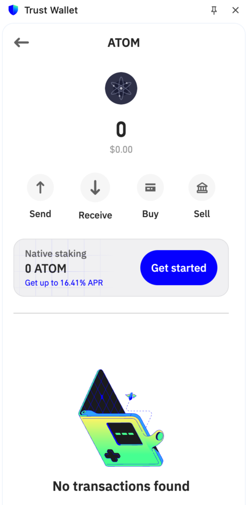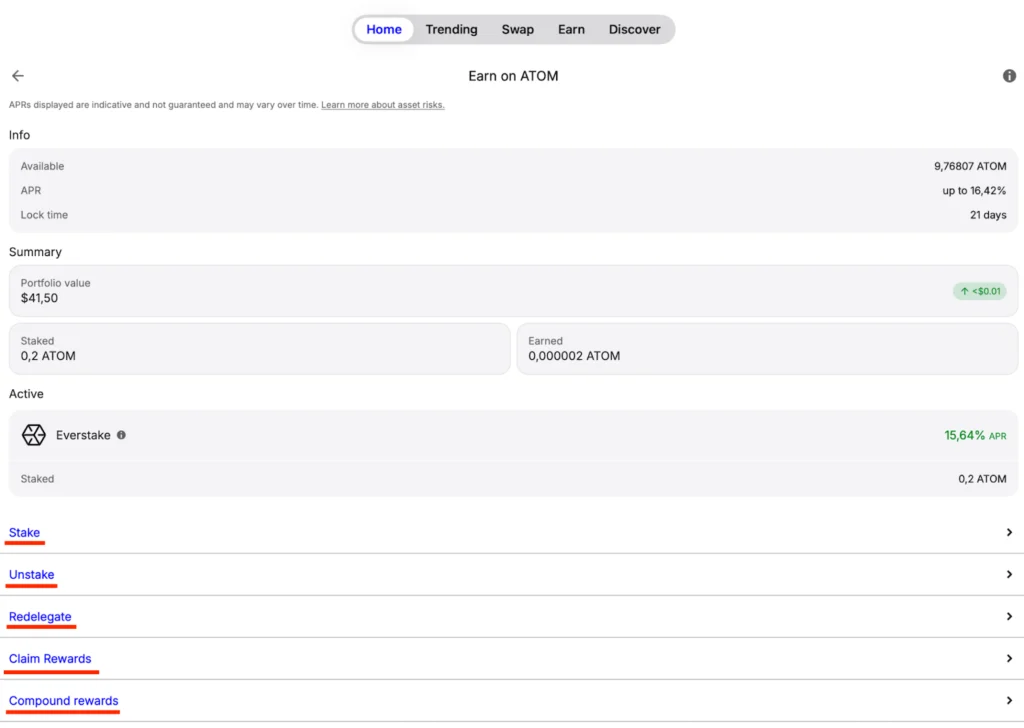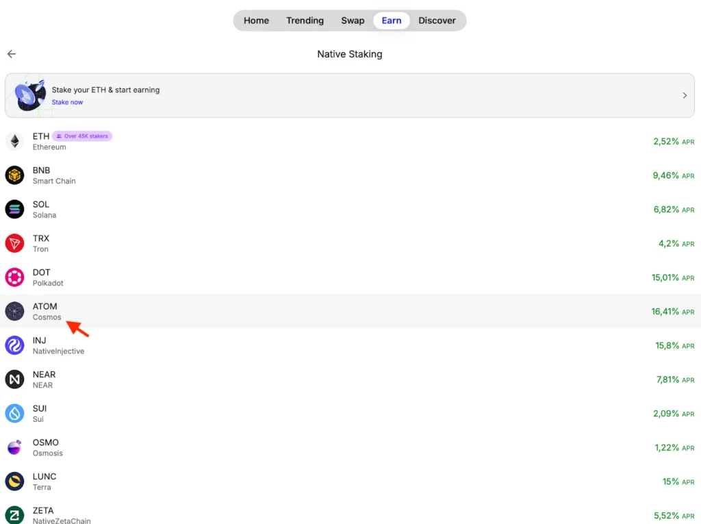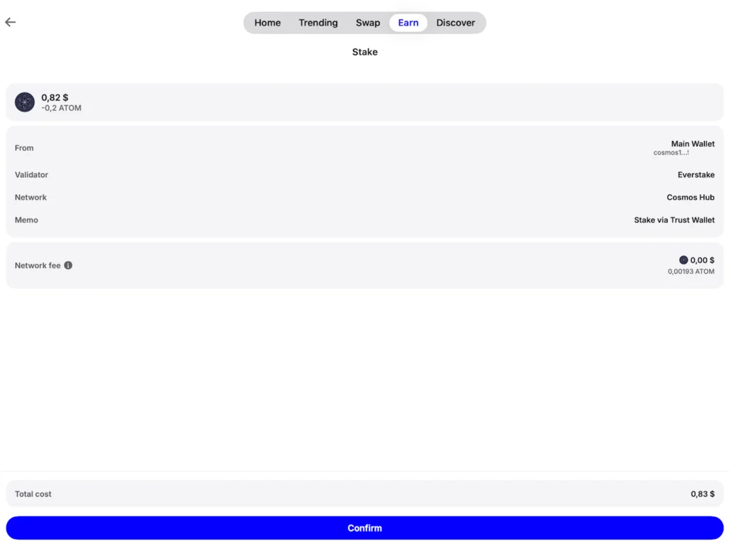 Trust Wallet keeps operations simple, enabling users to deposit, receive, and stake their assets, including ATOM tokens. It also displays all the available validators on each blockchain, helping users decide where to stake their assets.