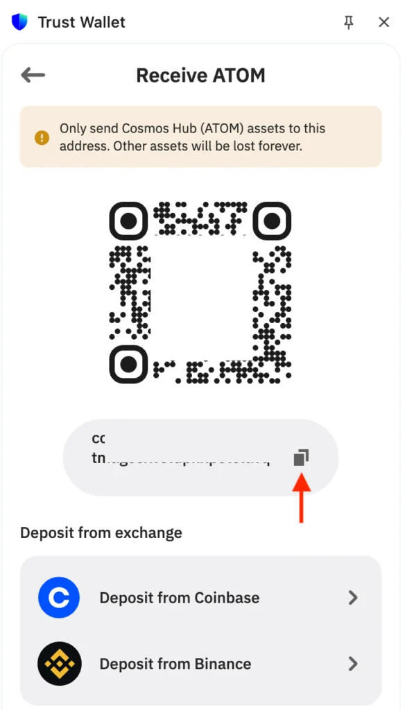 - To top up your balance from another wallet or exchange, hit Receive in your ATOM wallet and copy the address for further funding. If you’re going to buy ATOM on an exchange, just pick one from the list. Binance and Coinbase are already integrated into Trust Wallet, so just click on one of them and sign in to get funds from there.