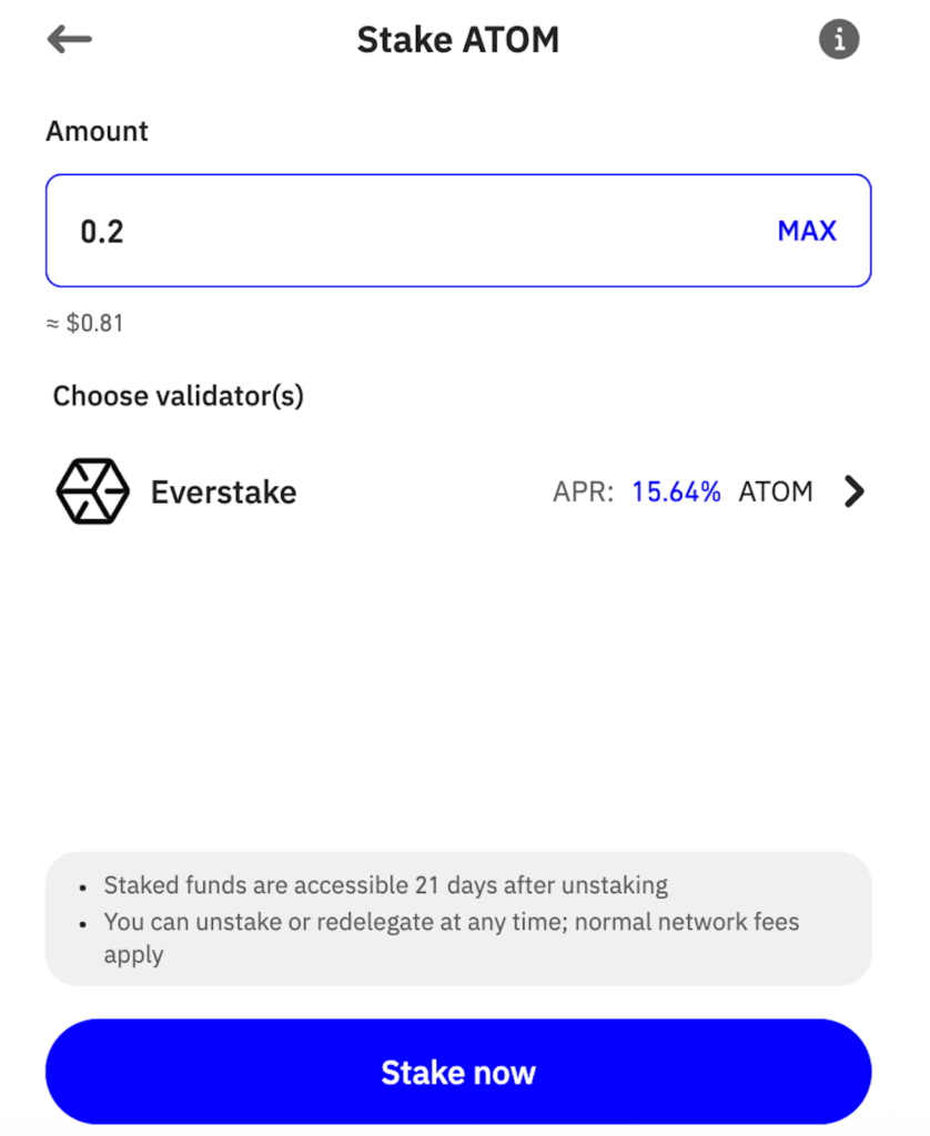 - Review the APR, unbonding period, your available balance, and hit Stake.