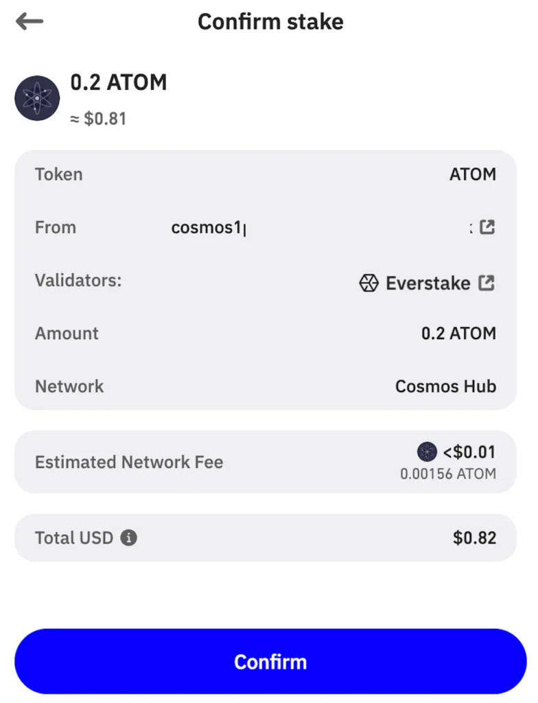 - Review staking transaction details. If everything is correct, hit Confirm.