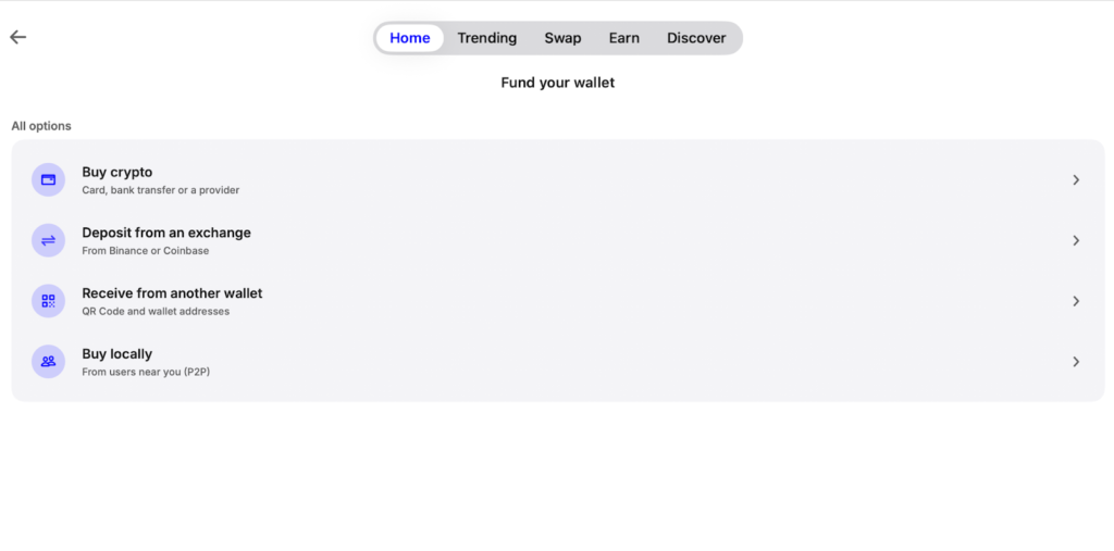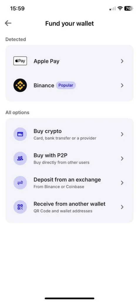 - Tap Fund Your Wallet. The mobile app offers an additional option: funding through Apple Pay. Inbuilt replenishment via the Binance exchange is also available.
