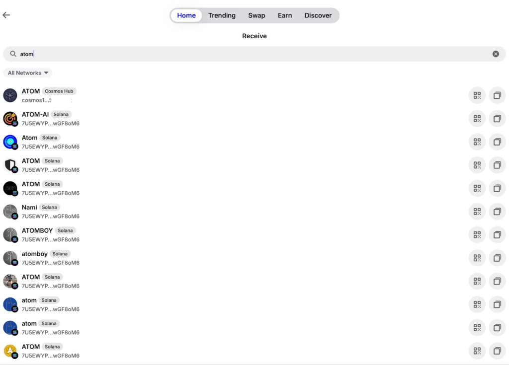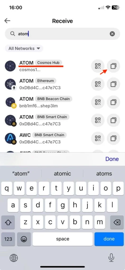 - If you want to send tokens from another wallet/exchange, click on Receive from another wallet and type ATOM in the search bar. Click on the copy icon right from ATOM (Cosmos Hub) to copy your address.