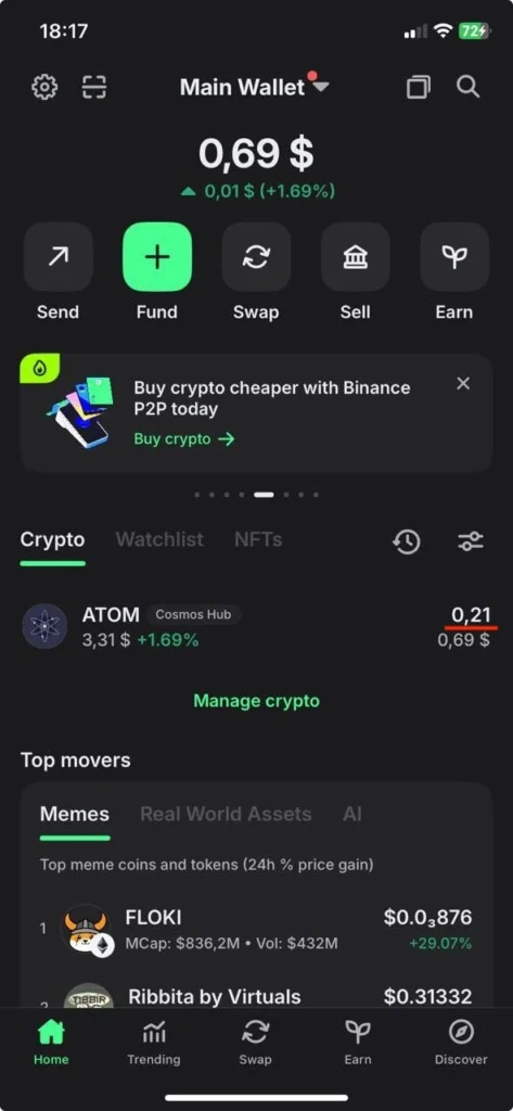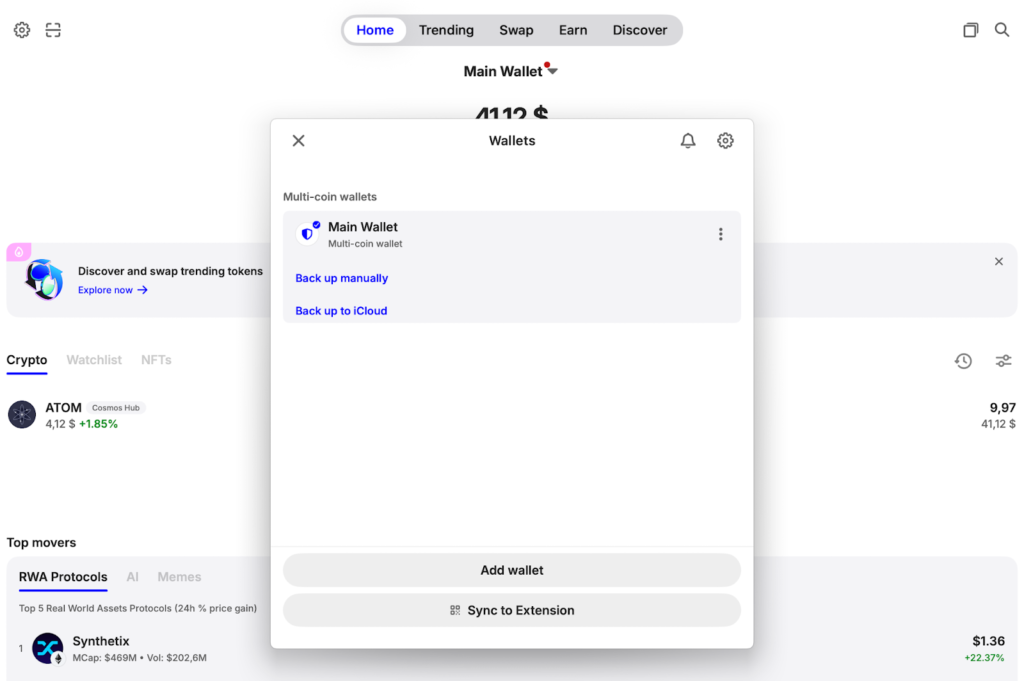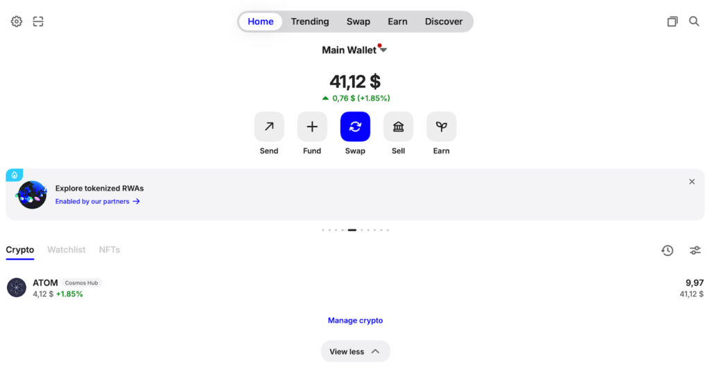 - Check the balance. Once the tokens arrive (within 1-2 minutes), your balance will automatically update on the homepage, displaying your featured ATOM wallet. Before proceeding with staking, it’s highly recommended to back up your wallet. The backup flow is identical to one in the Desktop app, so click on the Main Wallet at the top to complete it.