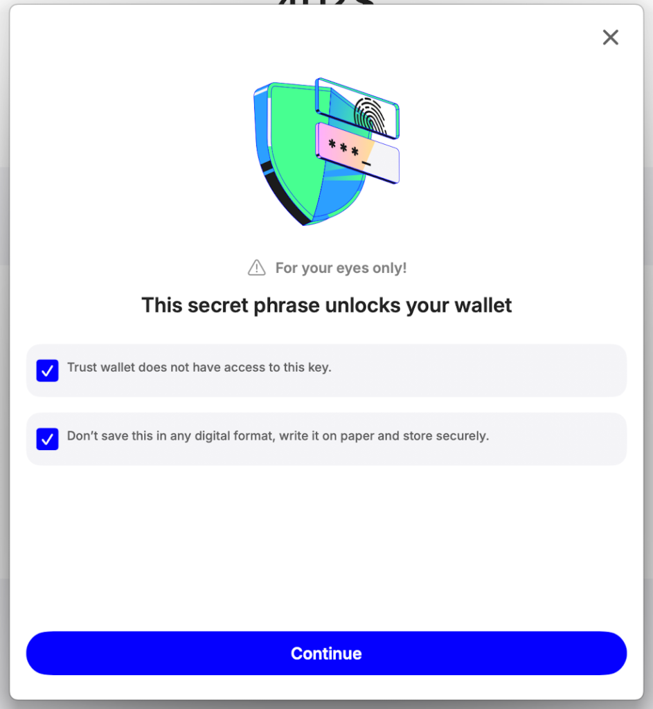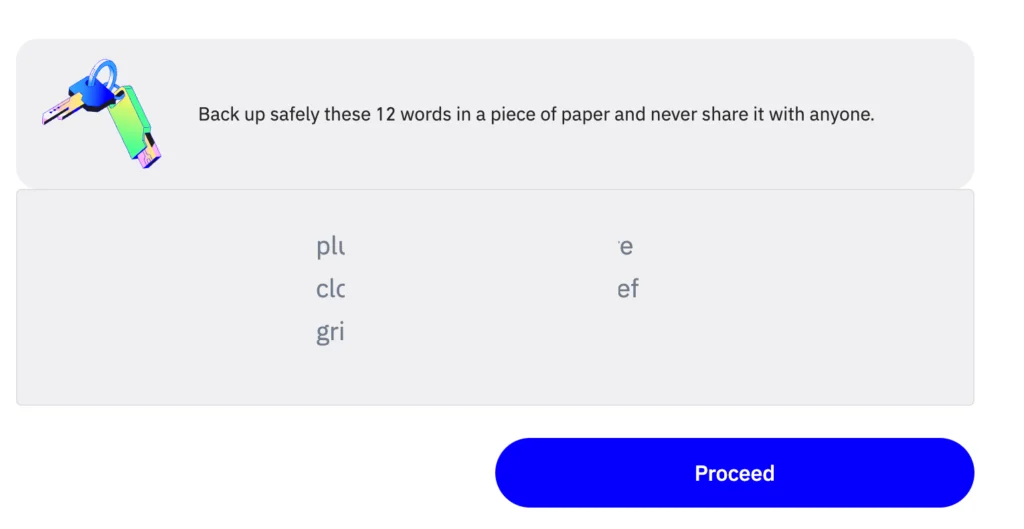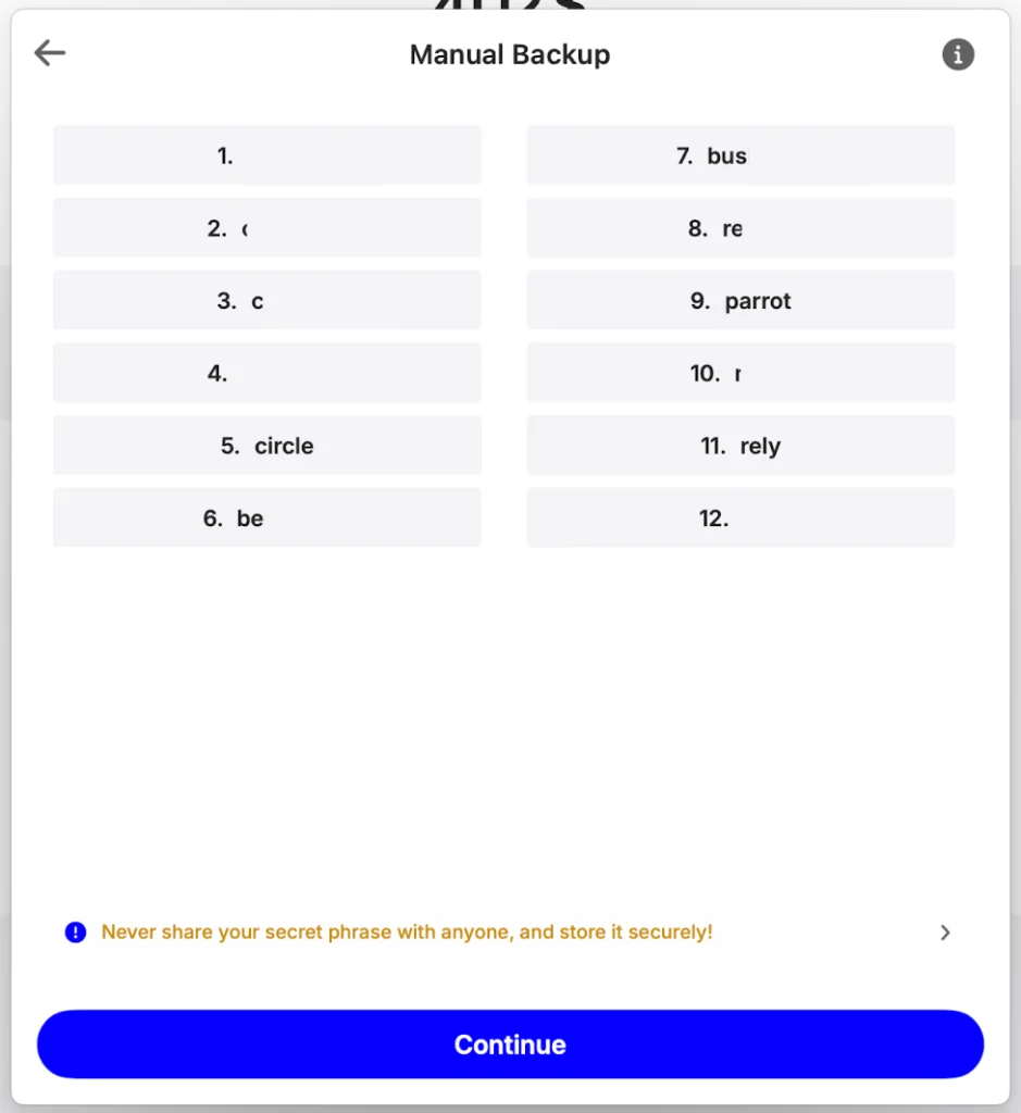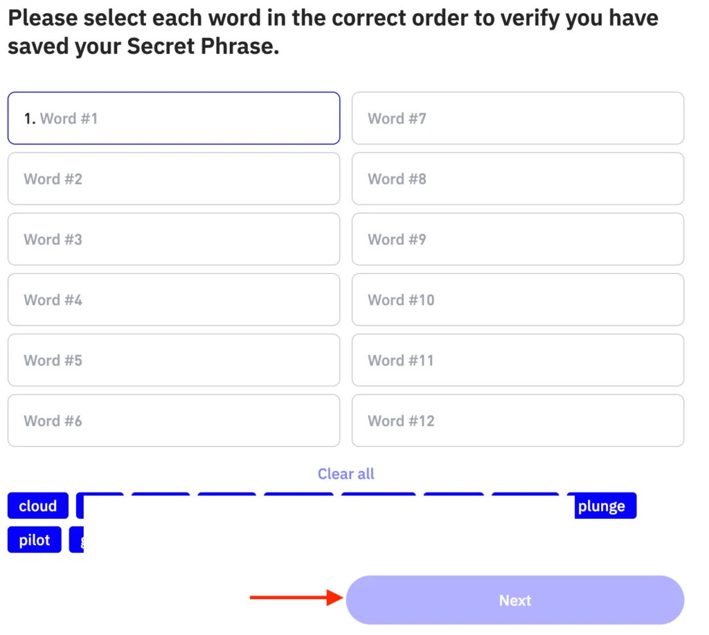 - Copy your secret phrase and click Continue. Pass a quick check by matching the words by number, and you’re all set!