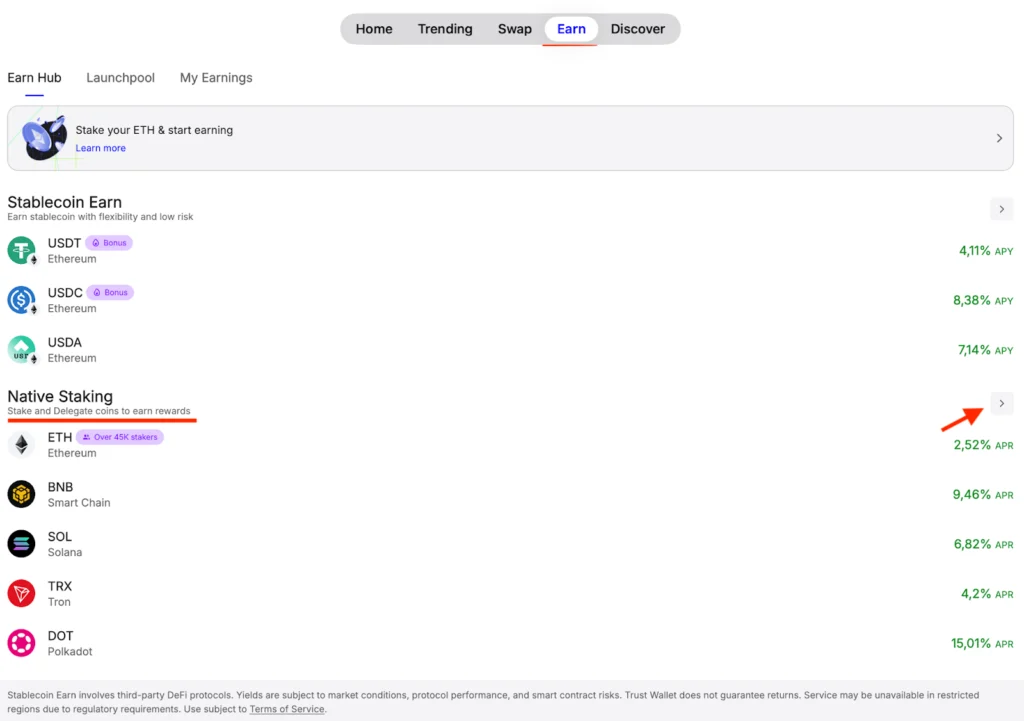 - Go to the Earn tab and hit the Native Staking button.