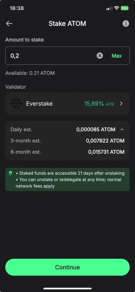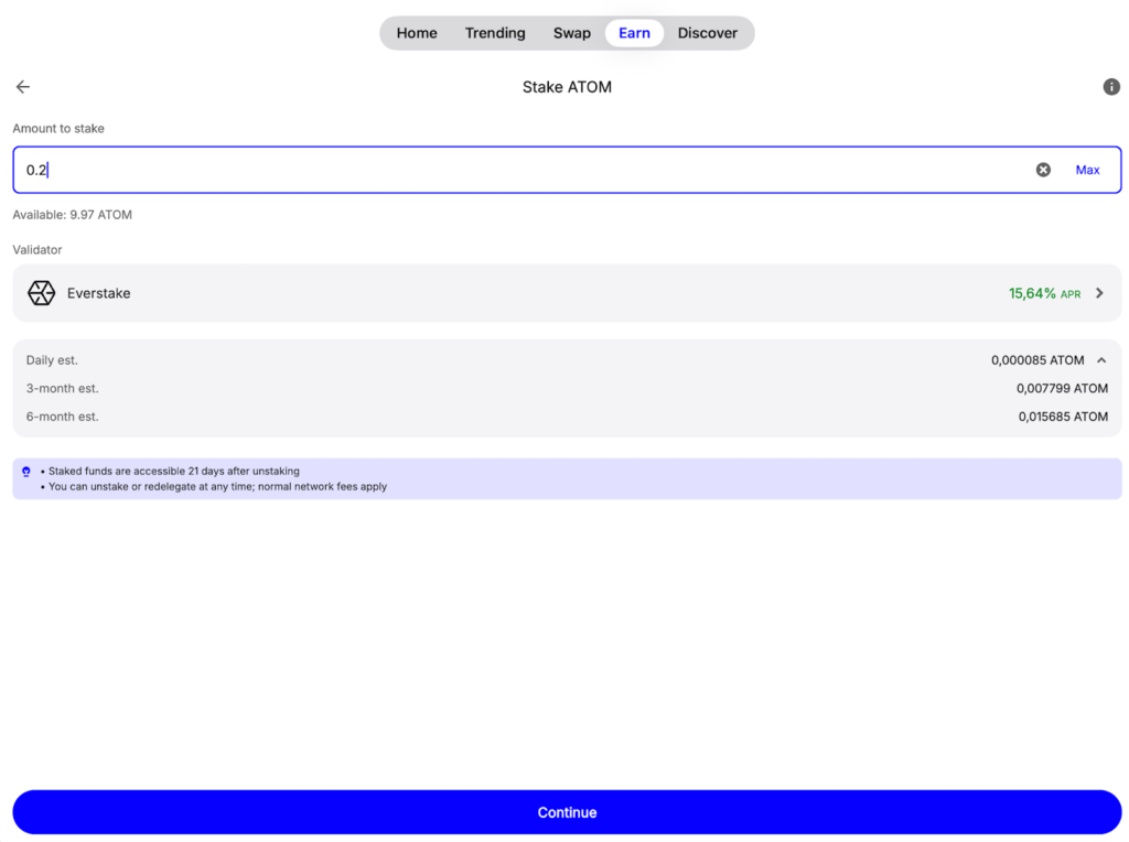 - Specify the amount you intend to stake, select a validator (e.g., Everstake), and click Continue.