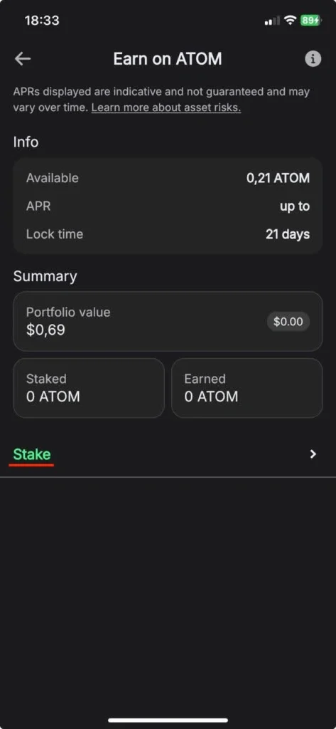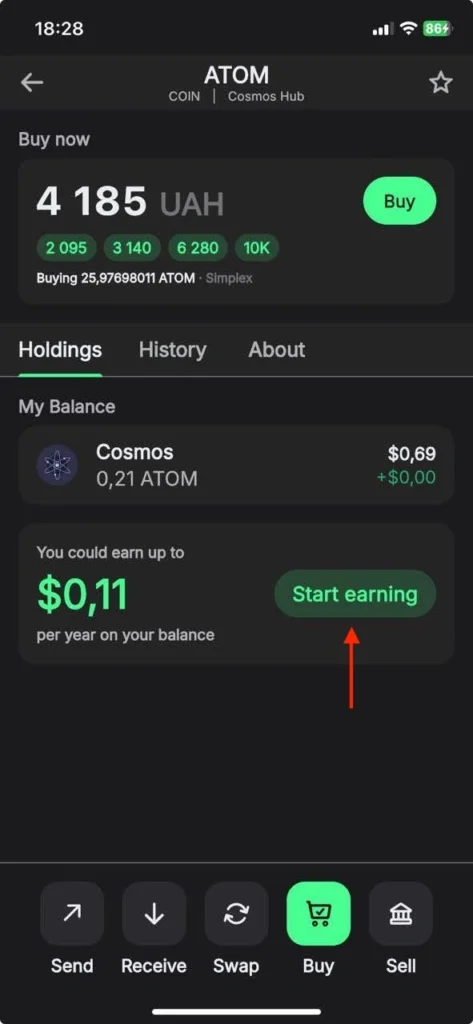- Enter the ATOM wallet from the Home Page. Scroll down and hit Start Earning.