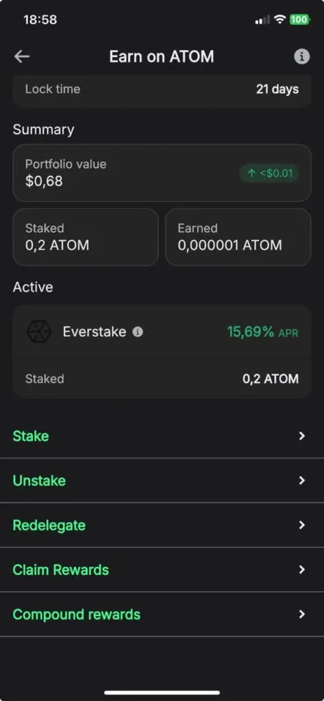 - Unstake: Unstake ATOM and get your tokens after the unbonding period of 21 days. Once it’s over, your tokens will become available in your balance. Remember that staking rewards stop accruing as soon as you confirm the unstake transaction.