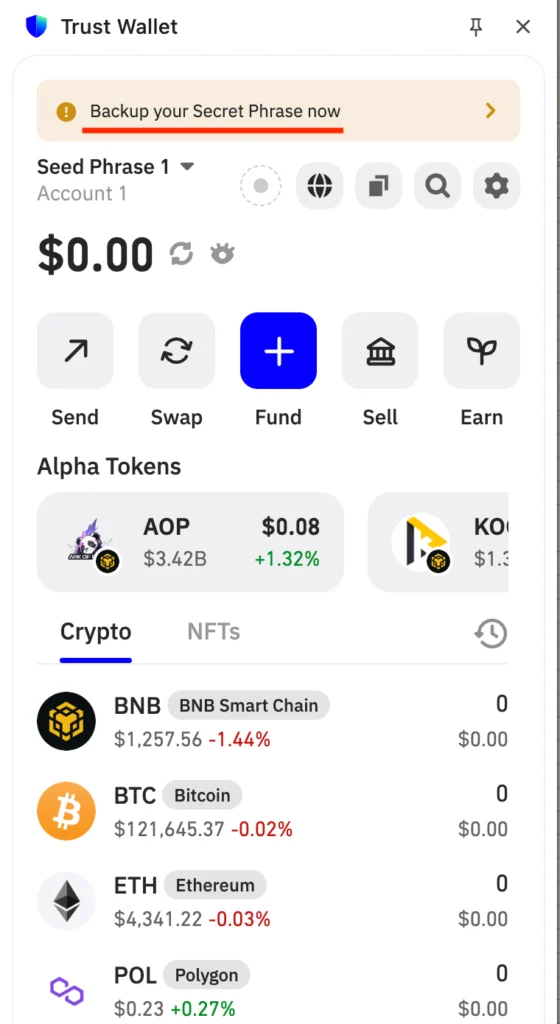 - Once opened, you’ll see a notification to back up your secret phrase. It’s highly recommended that you do so as soon as possible to ensure your assets are completely safe. Click on the notification.