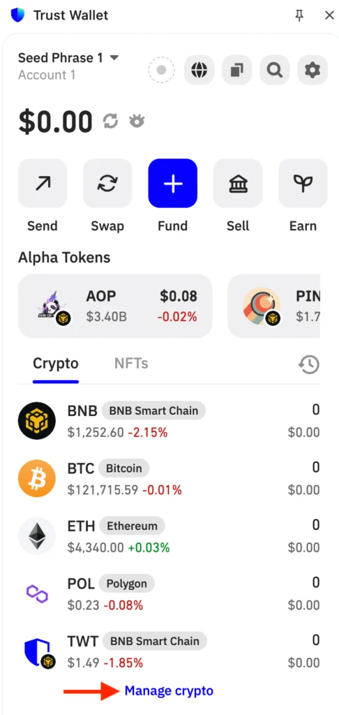 - Enable Cosmos Hub blockchain in your wallet. Click Manage Crypto in the extension.