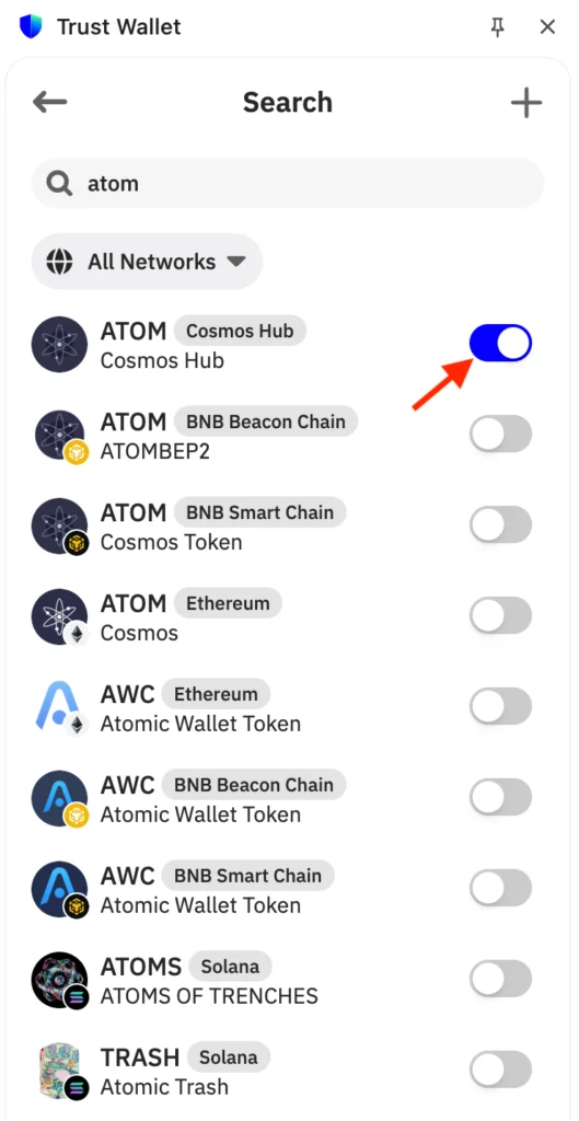 - Find ATOM (Cosmos Hub), toggle it on, and click on it to reach your ATOM wallet.
