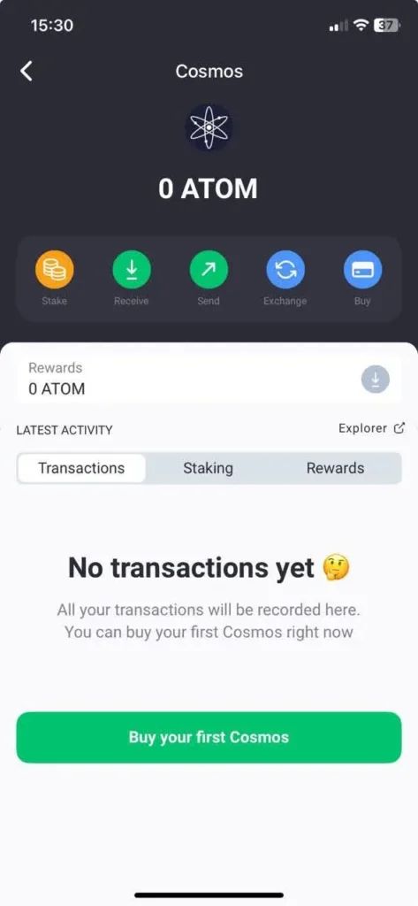 - Once the transfer or purchase is complete, your ATOM balance will appear in the wallet.