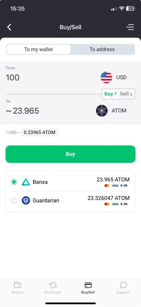 - You can also buy ATOM with crypto via the built-in Exchange tab. First, deposit another coin (e.g., Bitcoin), then use the Exchange option to swap it for ATOM.