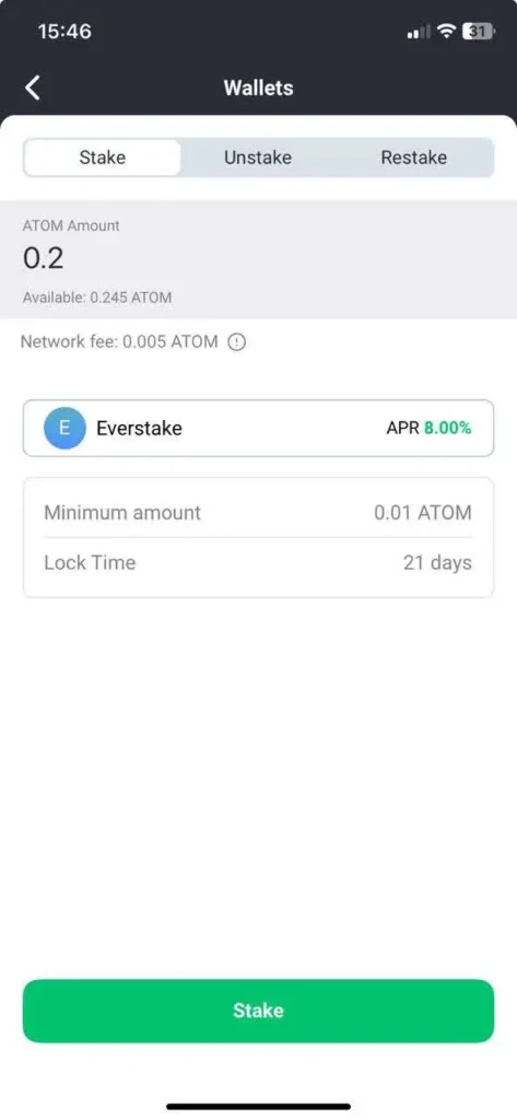 - In the ATOM wallet, click Stake, enter the amount you want to delegate, and choose a validator (e.g., Everstake).