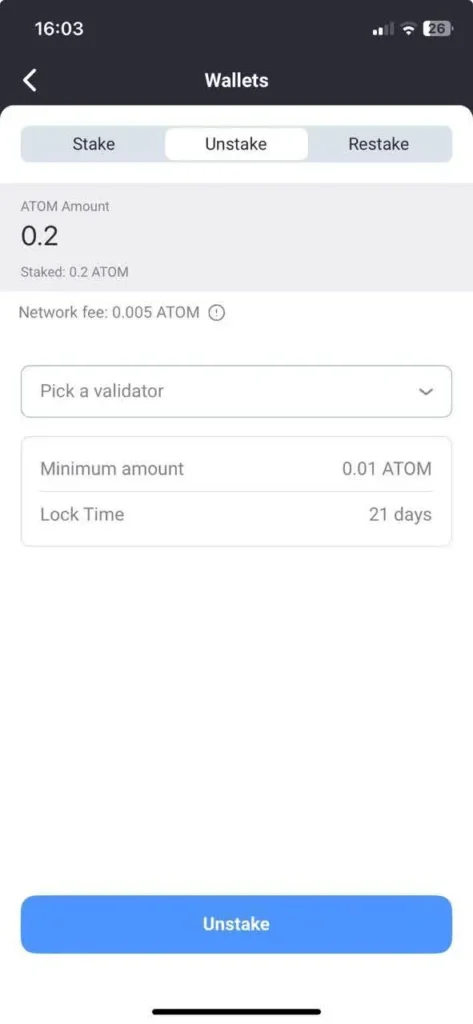 - In the ATOM wallet, tap the Stake icon and select Unstake.