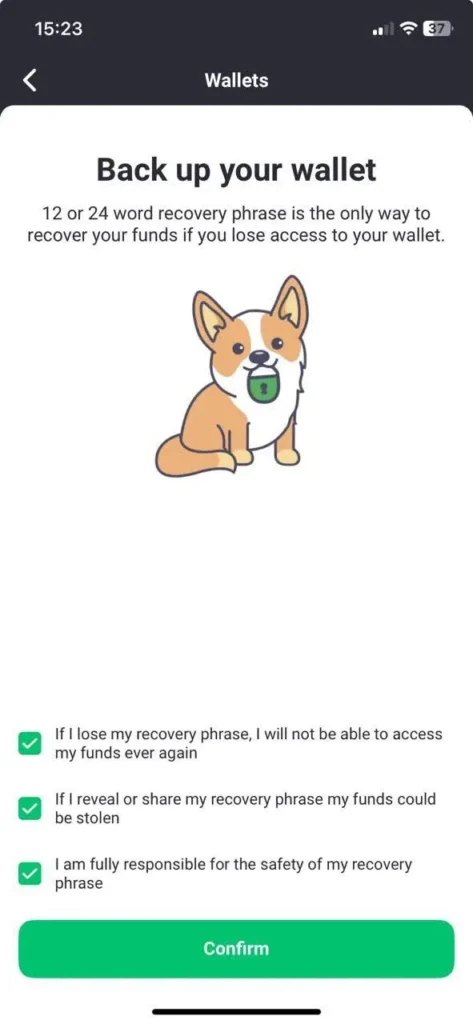- Click Back up on the pop-up to store your recovery phrase. It’s important to save your funds.