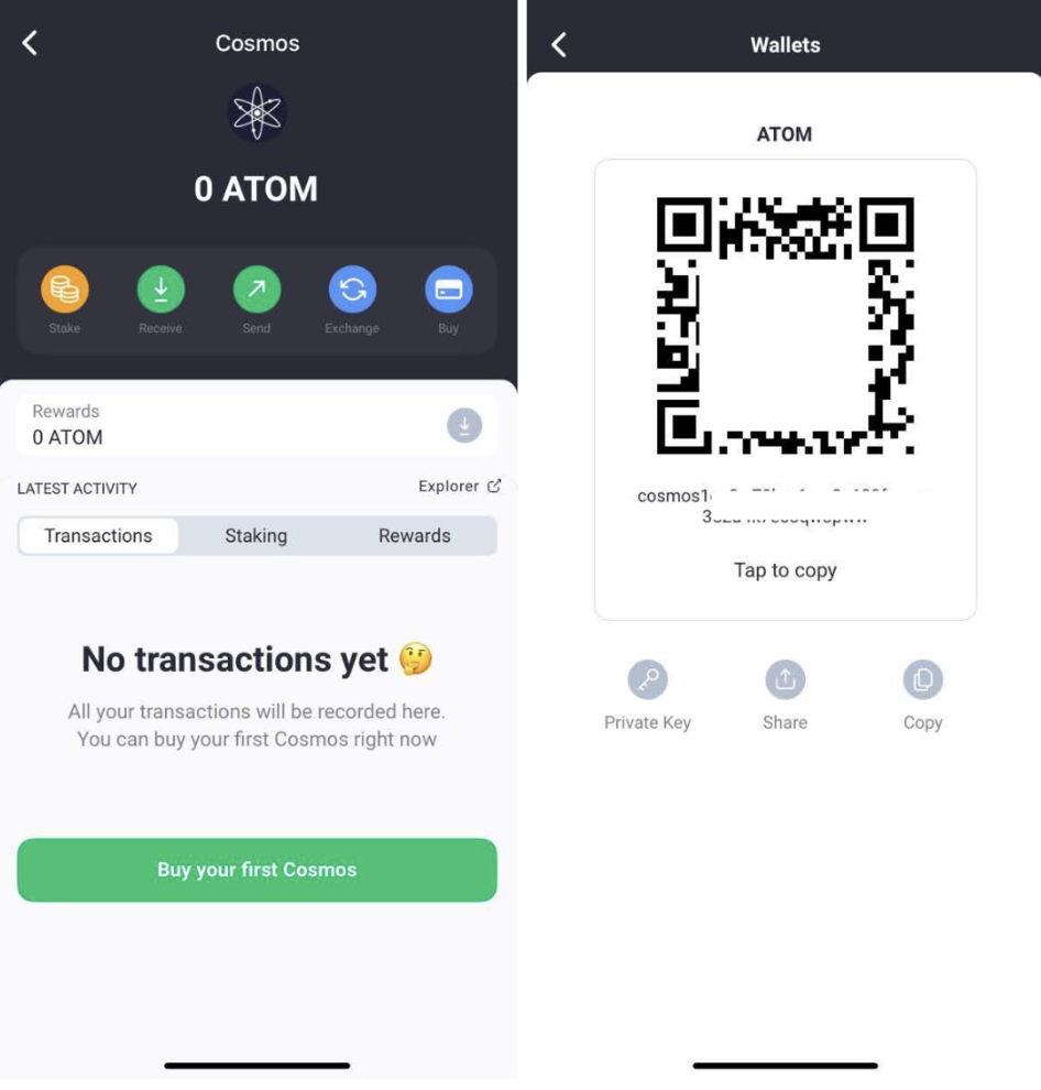 - To fund your wallet from another source, click Receive in the ATOM wallet to copy your address. Use it to transfer ATOM from another wallet or exchange.