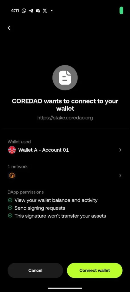 - Confirm the connection request in your wallet to authorize access to the staking website.