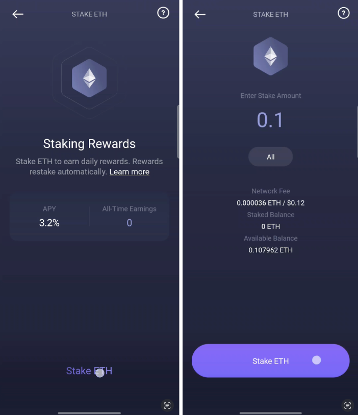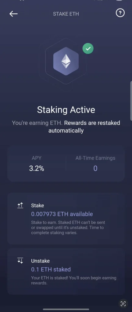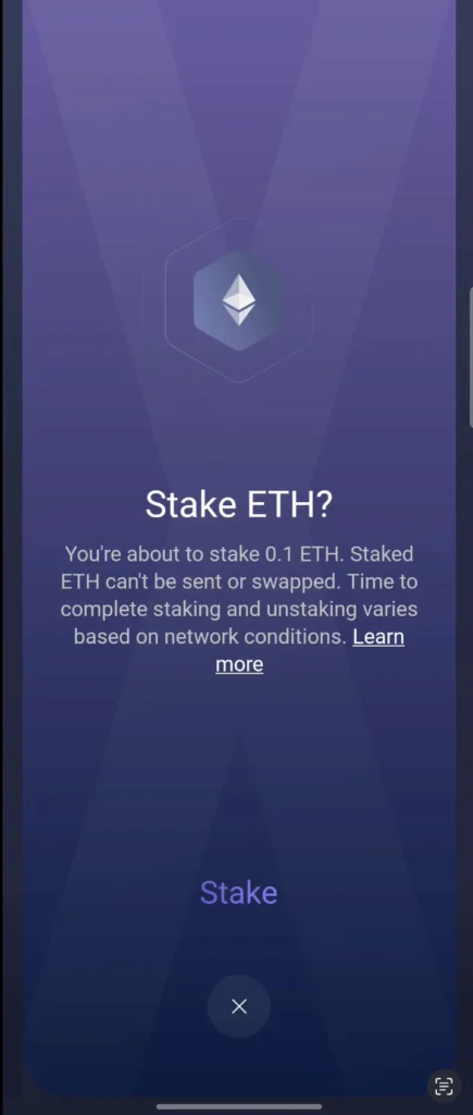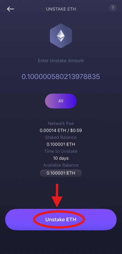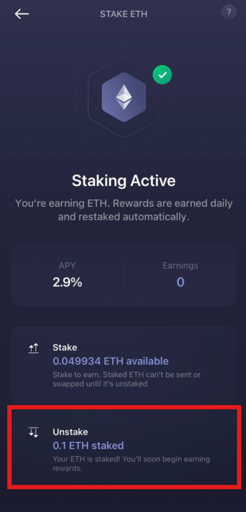 - Enter the amount of ETH to unstake (minimum 0.1 ETH, and at least 0.1 ETH must remain staked if you’re partially unstaking). Tap Unstake ETH.