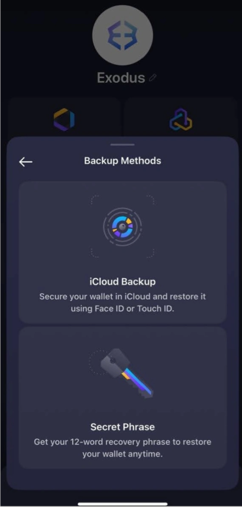 - Choose between iCloud Backup (Apple devices) or Secret Phrase (12 words you must write down).