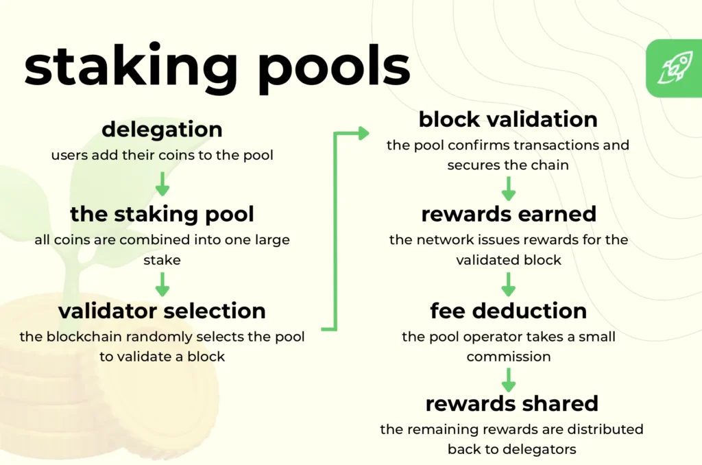 - Fee deduction and reward sharing: The pool operator takes a small commission fee, and the remaining rewards are distributed among all delegators proportionally.