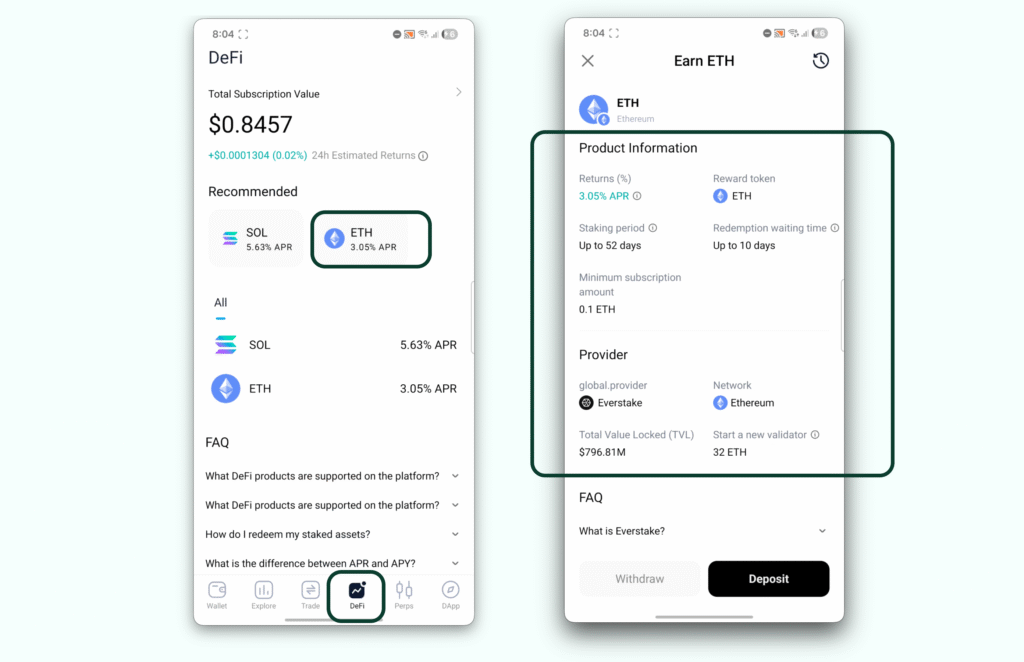 Staking rewards are flexible and vary based on network conditions. The current rate is always visible in the Product Information section of the DeFi tab.