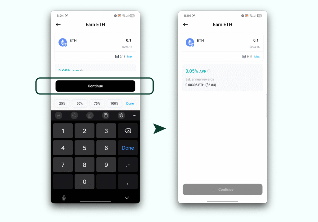 Before committing any ETH, take time to review the product information on the “Earn ETH” screen: