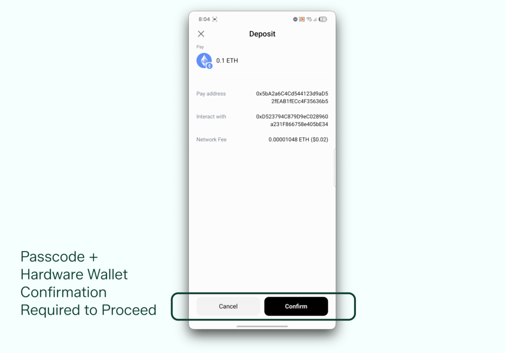 A transaction confirmation screen titled Deposit will appear, summarizing: