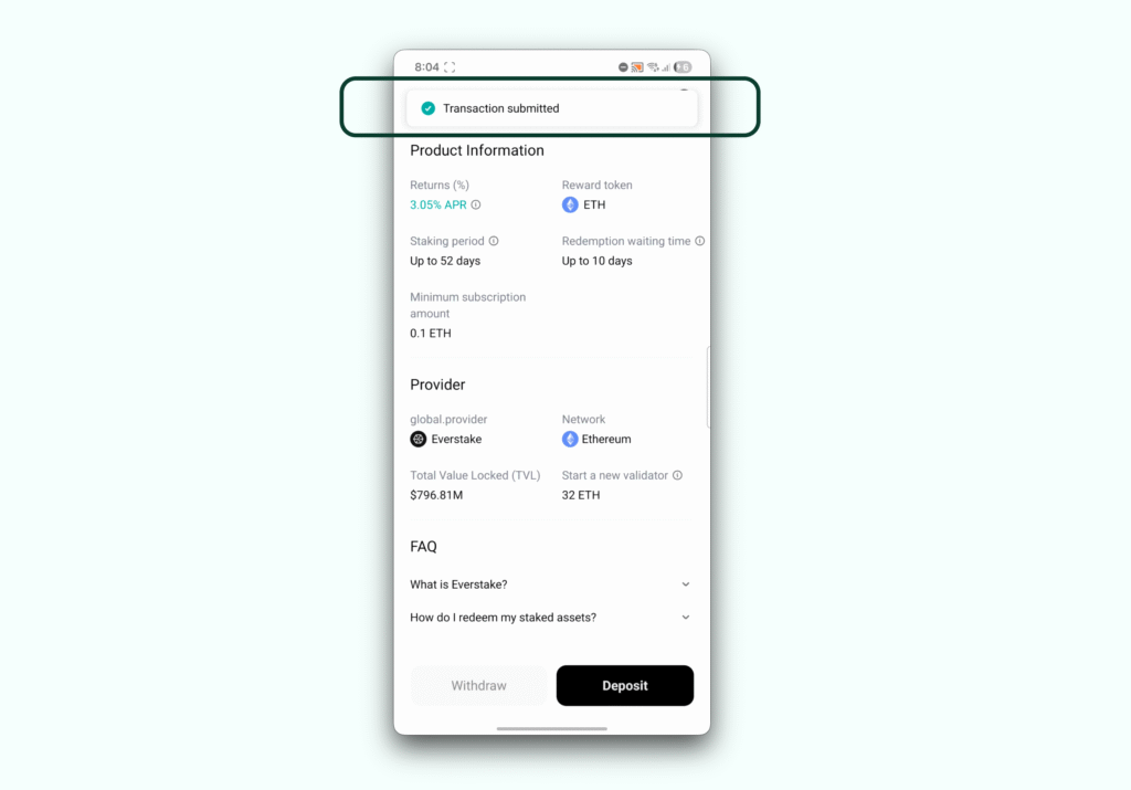 After confirmation, the app returns to the “Earn ETH” product page with a Transaction submitted notification at the top of the screen.