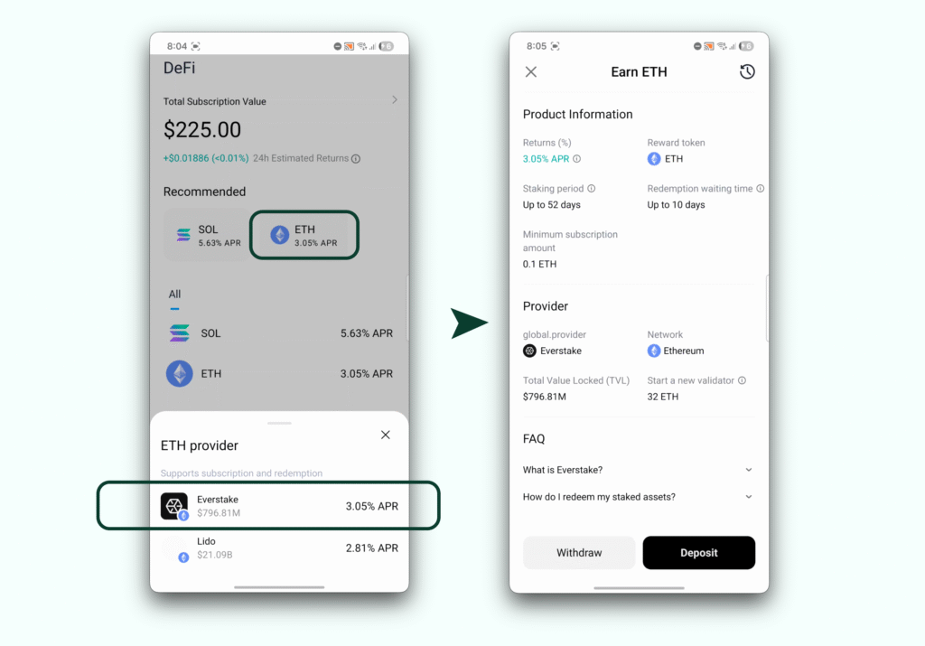 ETH staking is powered by Everstake, a non-custodial staking provider with over $7B in total staked assets to date, established in 2018 and supported Ethereum PoS since its early days.