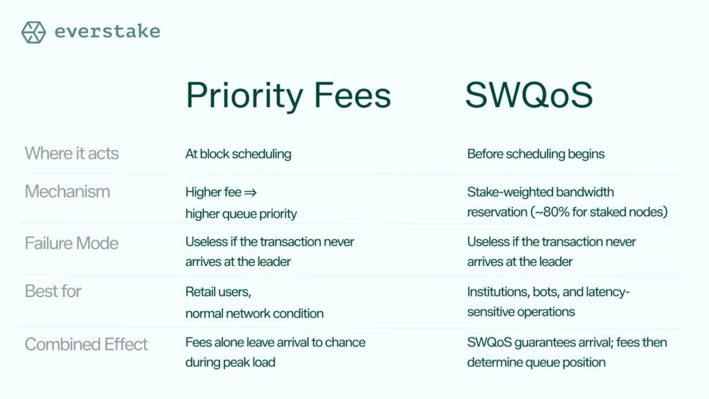SWQoS determines arrival time. Priority fees determine queue position after arrival.